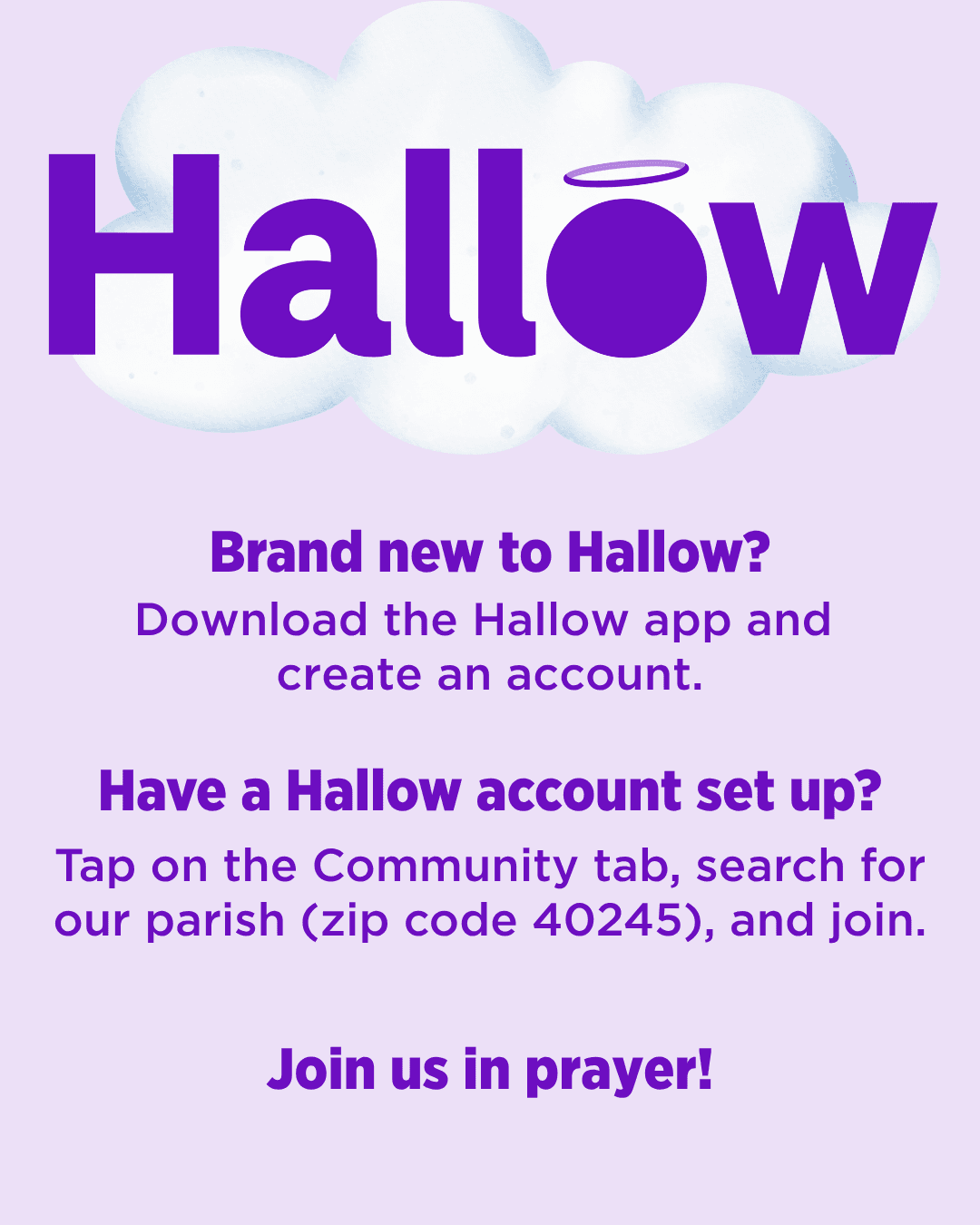 Visit hallow.com/parish, search by parish zip code. You’ll receive a special trial with full access to Hallow’s premium content. Prefer the free version? Just tap “Skip” — you’ll still have access to our parish page and the Advent prayer challenge.
